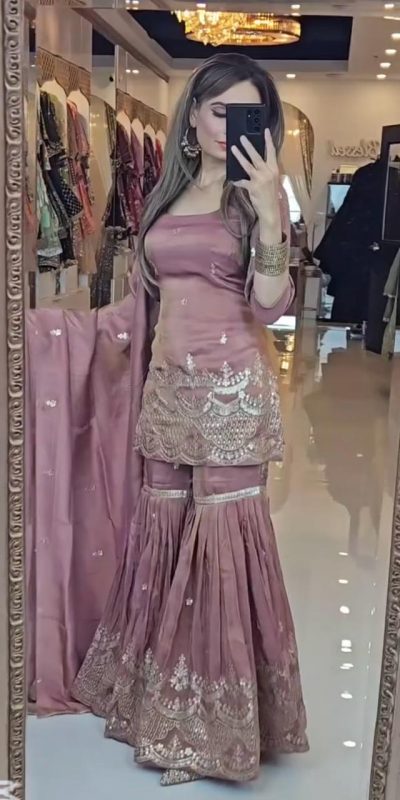 | Fabrics | Top Fabric : Heavy Chinon Silk With Heavy Embroidery Sequence Work with Rivet Moti Work*with Full Sleeve Top Inner : Heavy Micro Cotton Top Length : 38-39 Inch Top Size : Free Size Semi Stitched (Fully Stitched) (FULLY STITCHED READY TO WEAR)Gharara Fabrics : Heavy Chinon Silk With Heavy Embroidery Sequence Work with Rivet Moti Work* Gharara inner : Heavy Micro Cotton (Full stitched)Gharara Length:40-41 Inch (fully stitched) Dupatta Fabric : Heavy Chinon Silk With Heavy Embroidery Sequence Work and Lace Border |