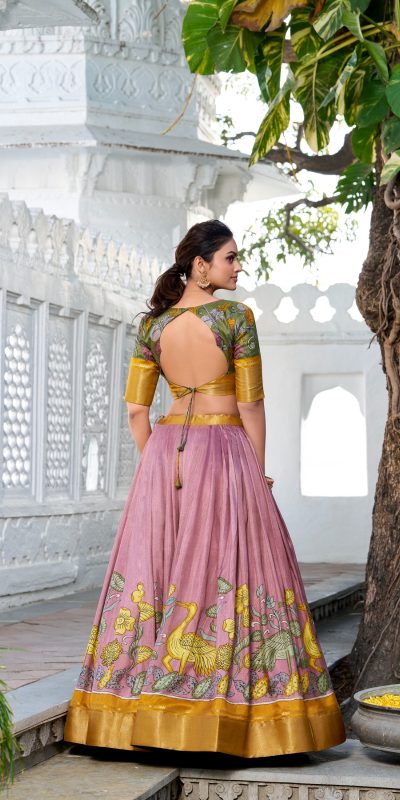 Lehenga: Dole Silk Inner Micro Cotton Work :Printed Kalamkari With Zari Weaving Border Length : 42+ Inch Type : Semi Stitched (Free Size)Waist : Supported Up To 42 Lehenga Stitching : Stitch With Canvas Lehenga Closer : Drawstring With Zip Length : 41Flair : 3.80 MeterBlouse : Dole Silk Jacquard Silk Work :Printed Kalamkari With Zari Weaving Border Sleeves : Half Sleeves Type : Un-StitchedBlouse Length : 0.80 MeterDupatta : Dola Silk Jacquard SilkDupatta work : Kalamkari Print With Zari Weaving Border Also Comes With Both Side Tassels Length : 2.4 Meter |