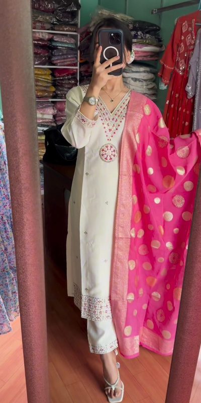White Chinnon Silk Embroidery Sequence Salwar Suit