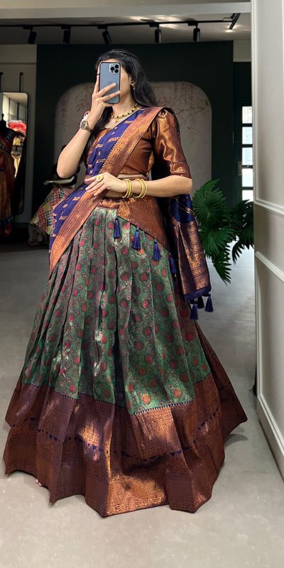 Navy Blue Silk Jacquard Zari Weaving Work Lehenga Choli