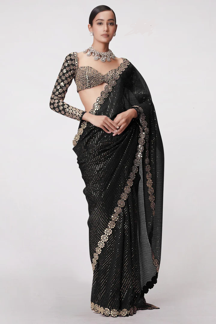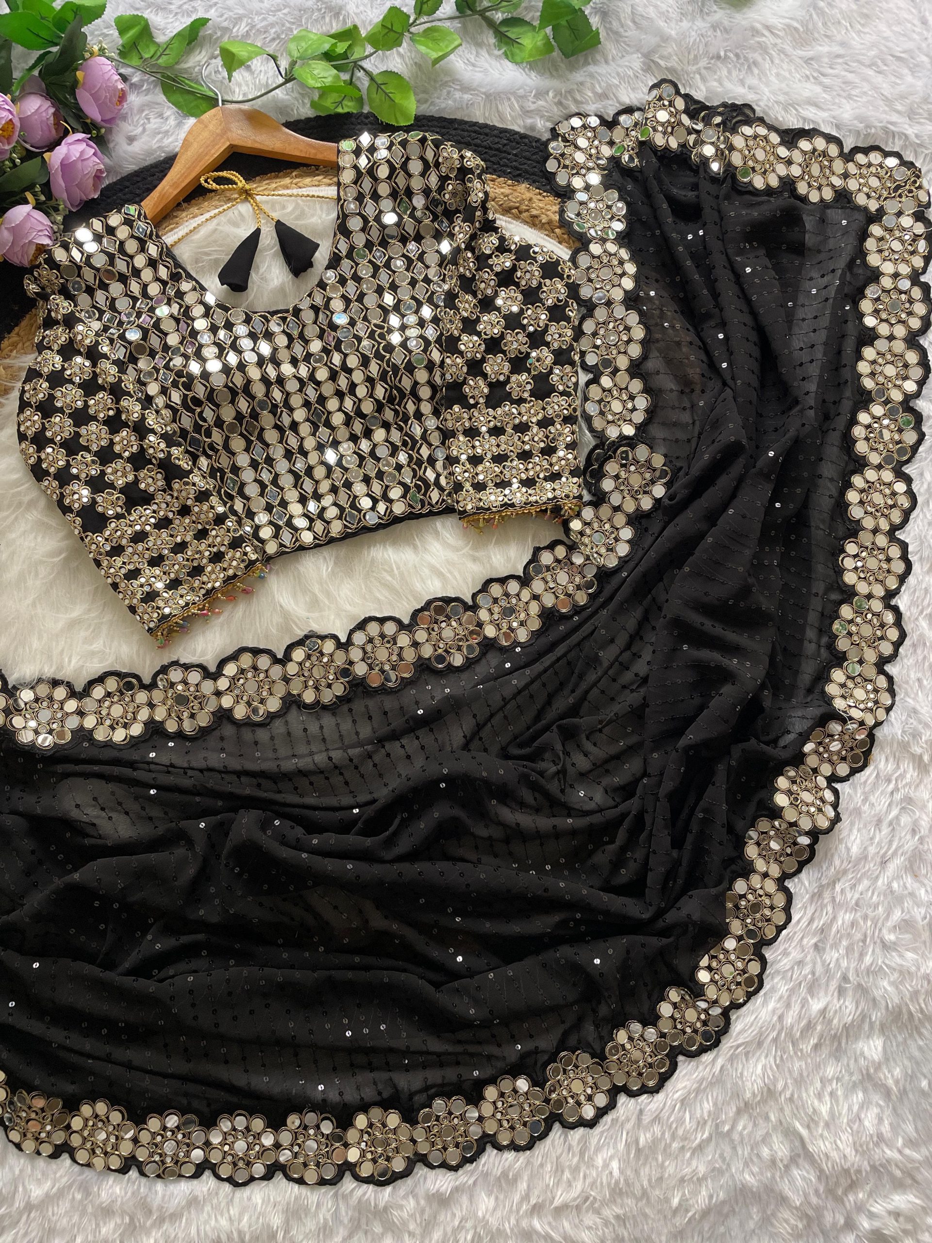 Stitched Blouse Heavy Faux Georgette Blouse With Heavy Embroidery Front & Back With Sleeves With Heavy Original Mirror Nd Teasels Attached In Sleeves
