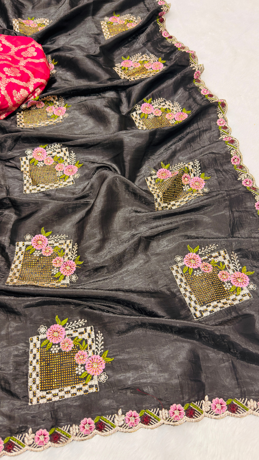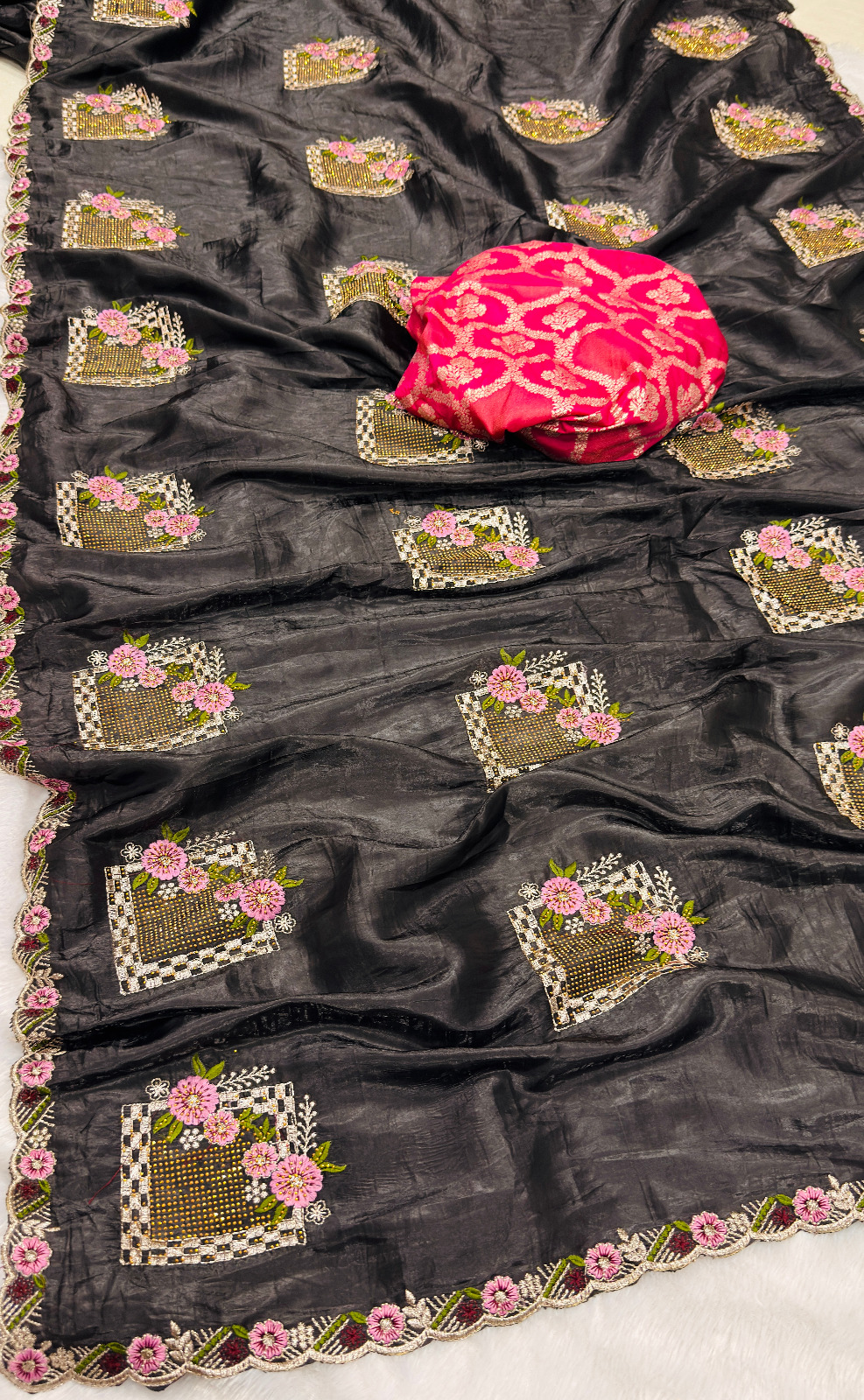 Saree Detail Saree Fabric : Pure paper silk crush Saree Work : Beautiful Floral Embroidery all over The Saree It also has Swarovski work on the buttas. With very beautiful cut work borderBlouse Fabric : Teamed with a Beautiful Pure Benarasi Silk Contrast Blouse