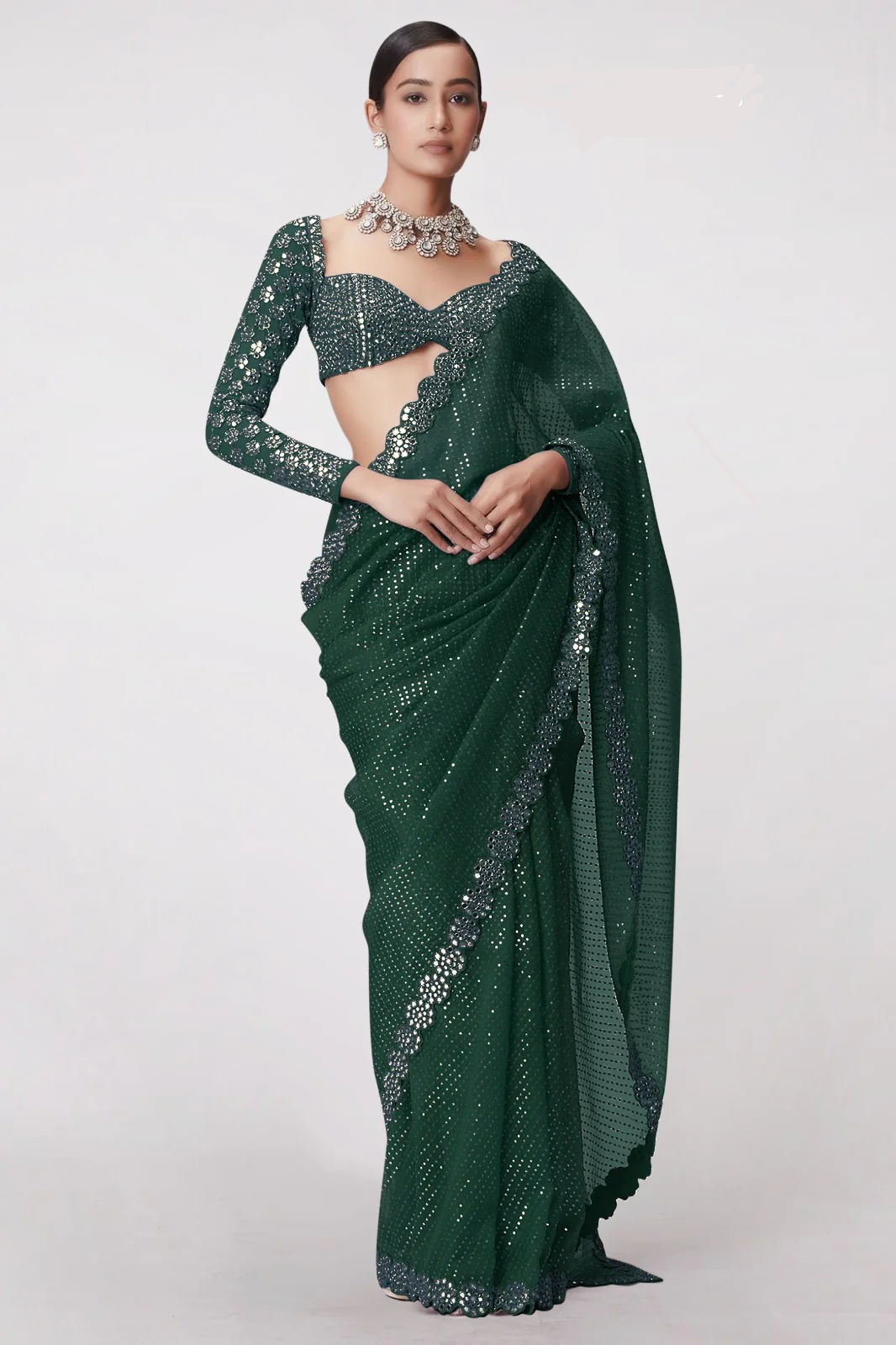 Stitched Blouse Heavy Faux Georgette Blouse With Heavy Embroidery Front & Back With Sleeves With Heavy Original Mirror Nd Teasels Attached In Sleeves