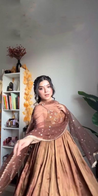 Brown Silk With Embroidery Sequence Work Anarkali Gown