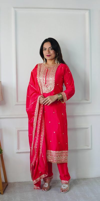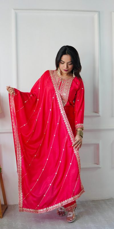 | Β Fabrics | Top Fabric : Pure Cosmo Silk With Heavy Embroidery Sequence Work top Inner : micro Cotton top Length : 45-46 Inch Top Size. : Free size Sami stitched Full StitchedΒ bottom Fabrics : Pure Cosmo Silk With Heavy Embroidery With Micro Cotton And Elastic Dupatta Fabrics : Pure Cosmo Silk With Embroidery Work And Four Said Lace Work |