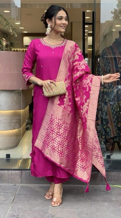 | Fabrics | Fabric :- Heavy Roman Silk Work :- Heavy Coding Work Bottom fabric :- Heavy Roman Silk dupatta Fabrice :- Banarasi Jacquard Dupatta Wide Beautiful Zari Dress :- Fully Stitched Kurti Length :- 43 Inch Pent Length :- 40 Size :-Free Size Semi Stitched |