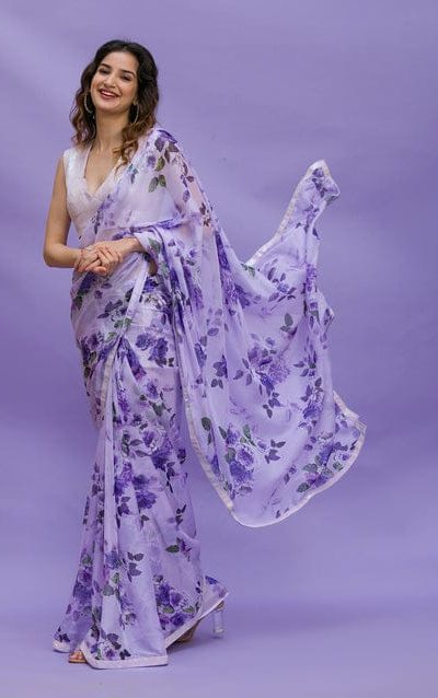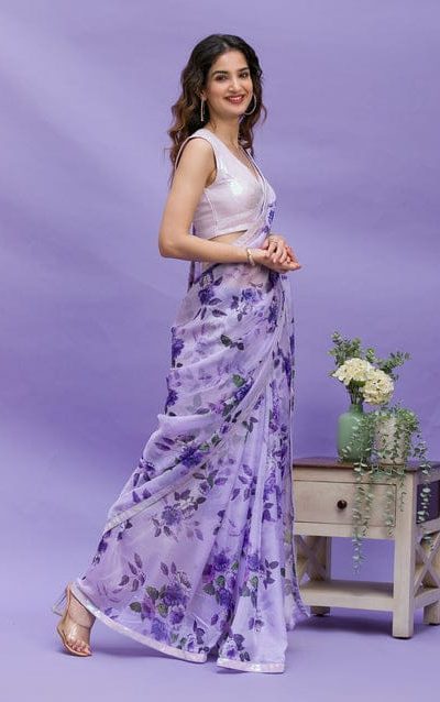 Violet Floral Digital Printed Georgette Lace Border Saree