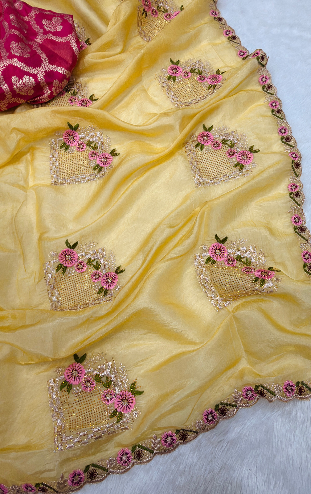 Saree Detail Saree Fabric : Pure paper silk crush Saree Work : Beautiful Floral Embroidery all over The Saree It also has Swarovski work on the buttas. With very beautiful cut work borderBlouse Fabric : Teamed with a Beautiful Pure Benarasi Silk Contrast Blouse