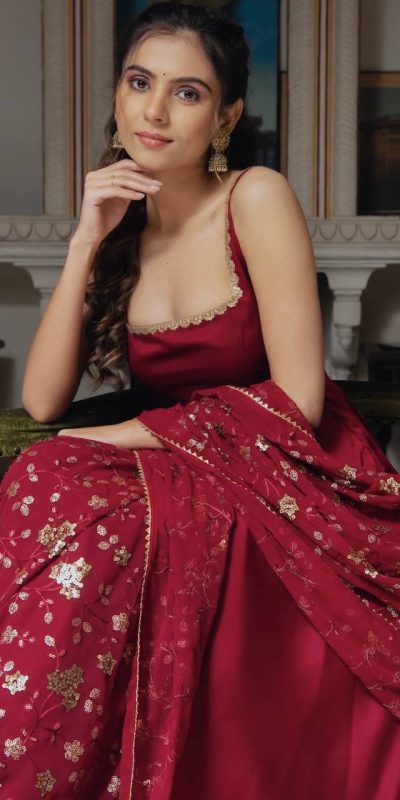 “The salwar suit’s anarkali silhouette is gracefully designed. It adds a sense of drama and elegance to the overall ensemble.”