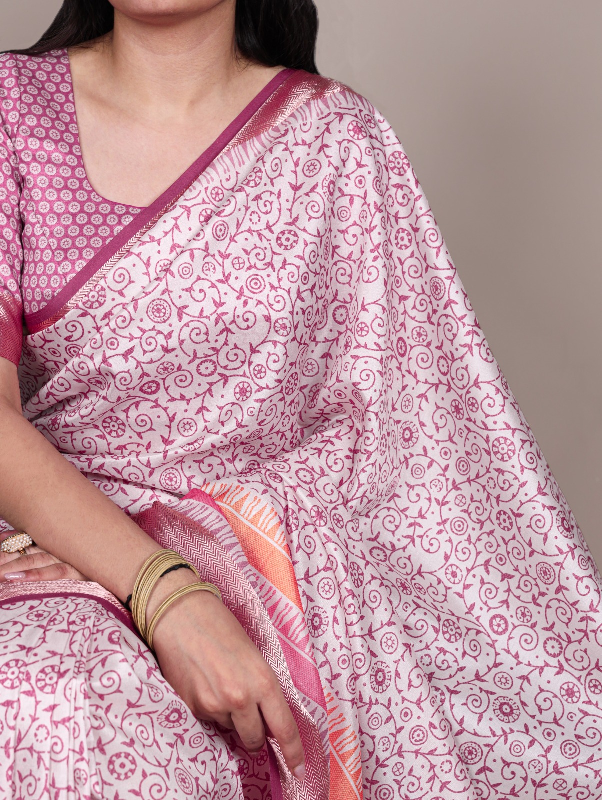 Light Pink Tasar Silk With Printed Viscose Border Saree