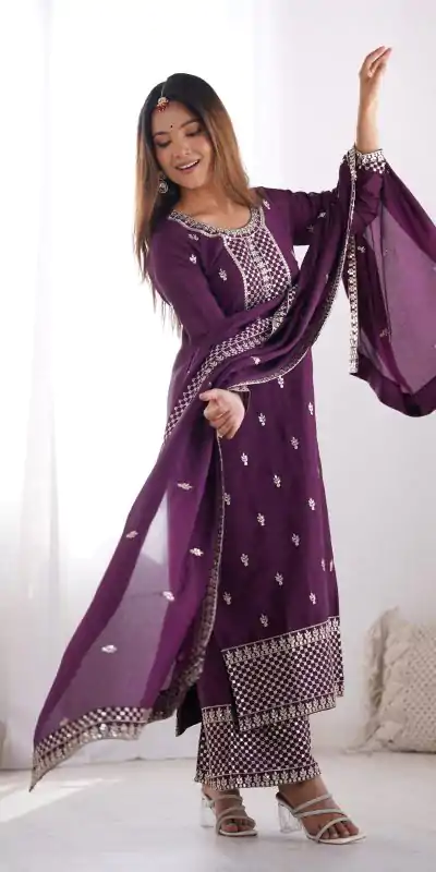 Wine Chinon Silk Embroidery Jari Work Salwar Suit