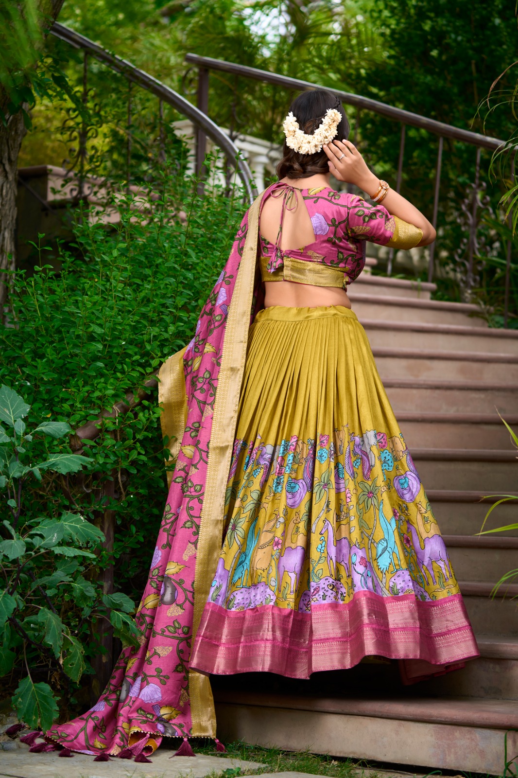 Mustard Dola Silk Kalamkari Print Zari Lehenga Choli