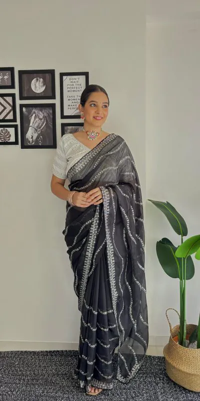 | Fabrics | Saree :Soft Organza (Tabby Silk) Work : Zari With Sequence And