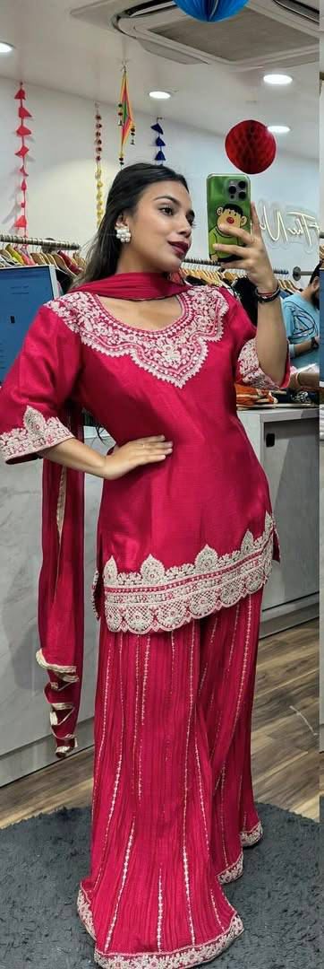 Sharara fabric :Pure Heavy Chinon Silk With Heavy Embroidery Coding Sequence Work (Fully Stitched)