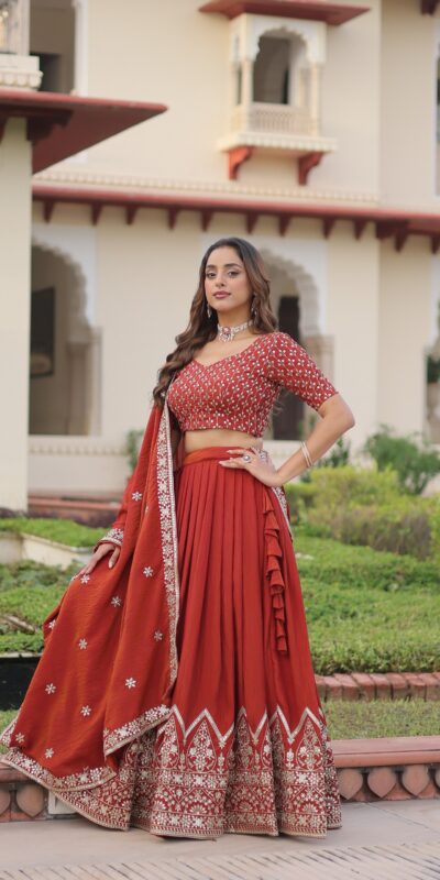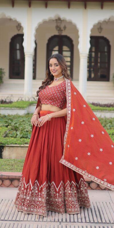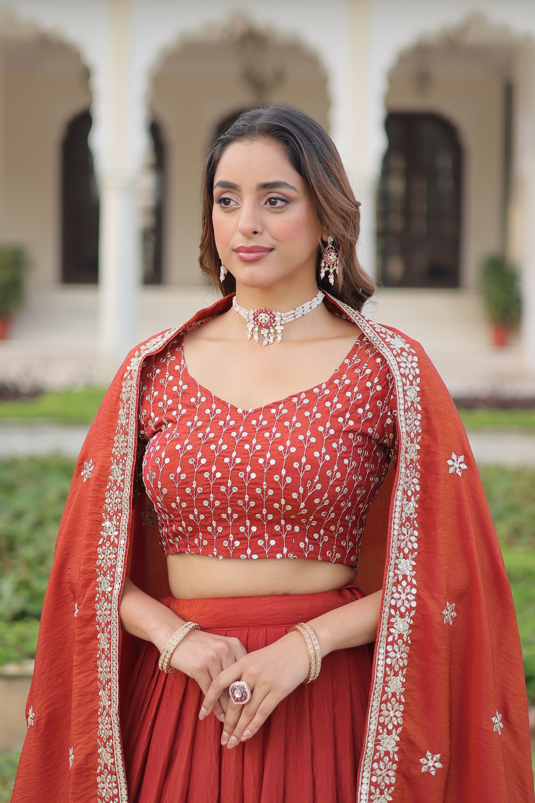 Rust Vichitra Silk Sequins Work Lehenga Choli