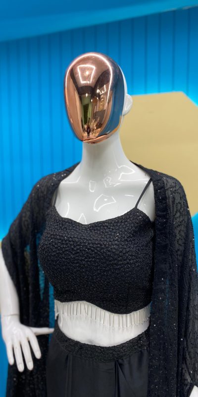 | Fabrics | Shrug :Rangoli Silk Work : Heavy Sequence Threads Embroidery And Lace Draped Skirt : Fiona Silk With Sequence Embroidered Work Full Flair Full stitched Free size Tube Choli : Rangoli Silk With Heavy Sequence Threads Embroidery Work Full stitched Fit Up to 44″ Height : 13.5” Inch Extra Sleeve Also Comes |