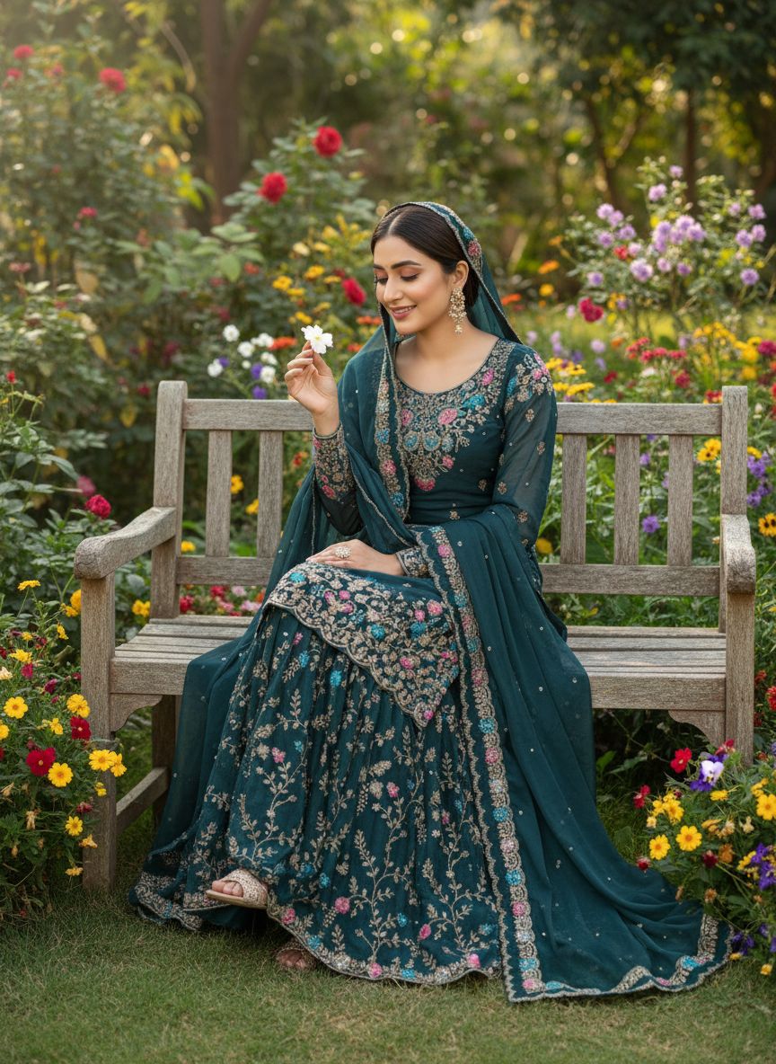Teal Organza Silk Sequence Moti Work Salwar Suit