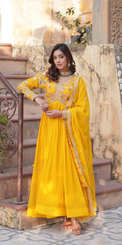 Yellow Faux Blooming Embroidery Zari Work Gown
